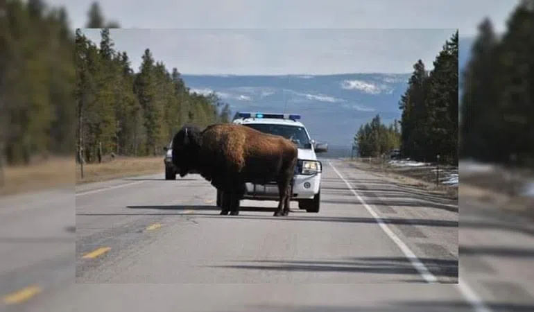 Montana police officers found themselves in a unique situation when bison were obstructing the highway. The Gallatin County Sheriff’s Office shared a picture of the bison on their Facebook page saying, “Being a deputy around West Yellowstone comes with unusual duties, including herding bison off the highway so no one gets hurt. When deputies respond to a bison on the road, they turn on lights and siren and encourage the animal to leave the road with an air horn. With a reluctant bison, they’ve been known to play AC/DC’s ‘Hell’s Bells’ over the speakers – that usually seems to work.”